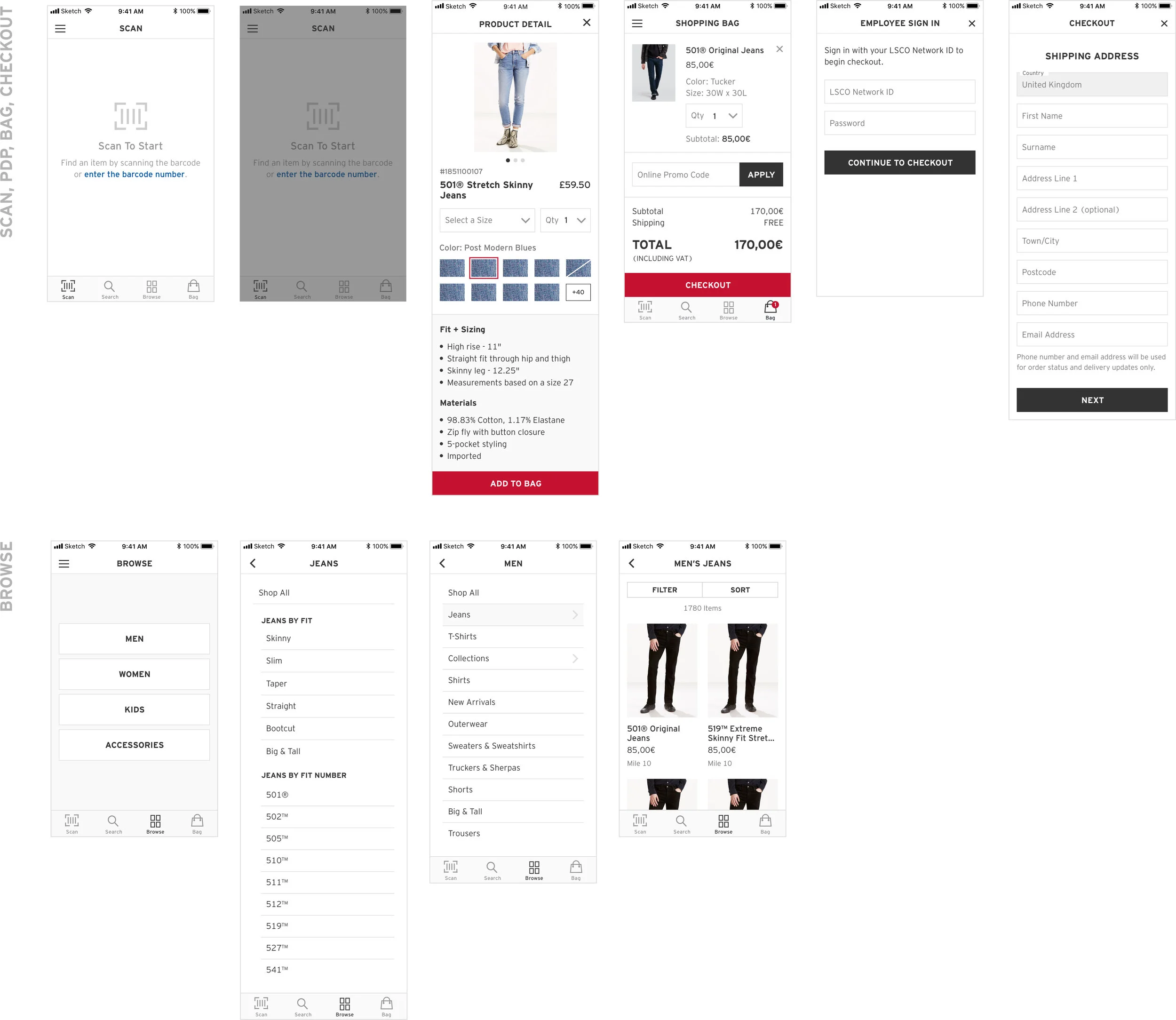 A few highlights below showing some of the core features of AOS (Scanning, Product Detail Page, Browse and Bag).
